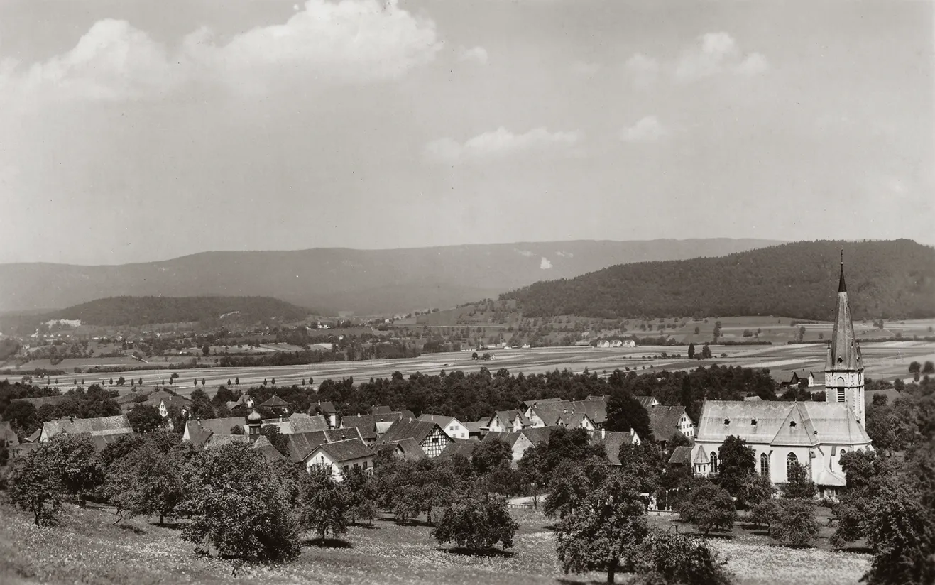 "Spreitenbach vor der Industrialisierung um ca. 1934". Im Vordergrund die kath. Kirche und der alte Dorfkern. Im Hintergrund die Seidenfabrik und deren Kosthäuser, aber noch kein Güterbahnhof, keine Autobahn und kein Einkaufszentrum. Ein Blick weit zurück in die Vergangenheit, der ohne eine der bedeutendsten Erfindungen nicht möglich wäre: Vor 200 Jahren gelang die erste dauerhafte heliographische Aufzeichnung des Lichts.