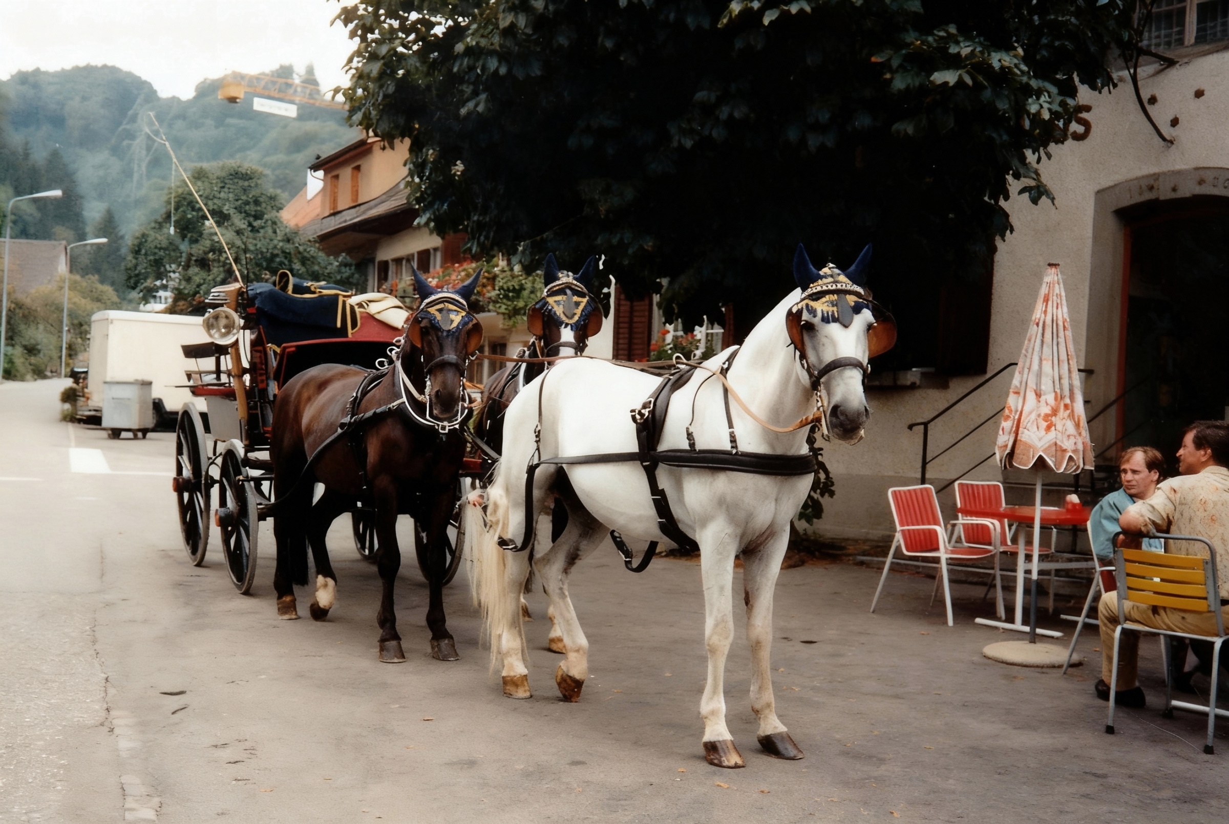 Ein Pferdegespann vor dem Gasthof "zu den drei Sternen". Foto: Archiv des Ortsmuseums. Urheber unbekannt.