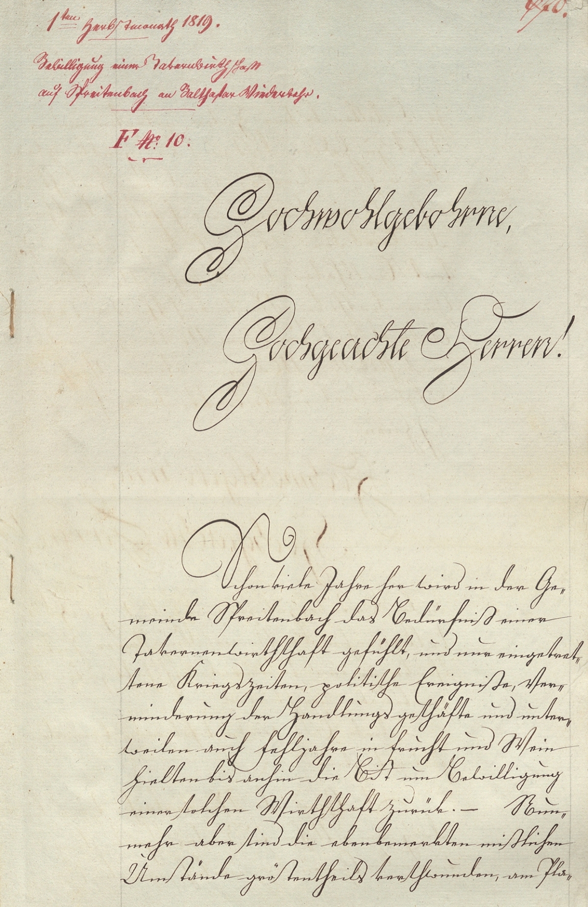 "Hochwohlgebohrne Hochgeachte Herren. Schon viele Jahre her wird in der Gemeinde Spreitenbach das Bedürfnis einer Tavernenwirthschaft gefühlt, und nur eingetretene Kriegszeiten, politische Ereignisse, Verminderung der Handlungsgeschäfte und unter weilen auch Fehljahre in Frucht und Wein hielten bis anhin die Bewilligung einer solchen Wirthschaft zurück."