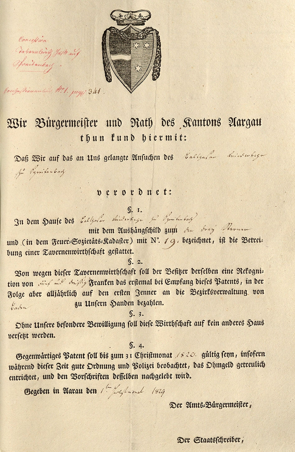 Am 1. September 1819 bewilligte der "Rath" des Kantons Aargau das Gesuch des Balthasar Wiederkehr zu Spreitenbach und erteilte dem Lokal mit dem "Aushängeschild zu den drei Sternen" das Patent als Tavernenwirtschaft. Dieses war bis zum "31 Christmonat 1820 gültig, insofern in dieser Zeit gute Ordnung und Polizei beobachtet, das Ohmgeld getreulich entrichtet, und den Vorschriften desselben nachgelebt wird." Kopie aus dem Staatsarchiv des Kantons Aargau.