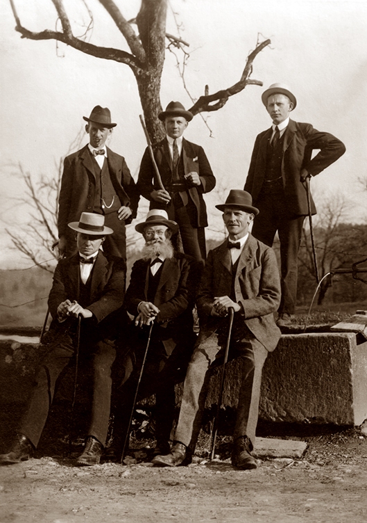 "Brunnen auf dem Heitersberg (Albert Lips, Walter Lienberger, Ernst Lips, Albert Lienberger und Jean Lips, die sitzende Person in der Mitte, ist nicht bekannt)". Restauriertes Foto aus dem Nachlass von Kurt Wassmer. Sammlung des Ortsmuseums Spreitenbach.