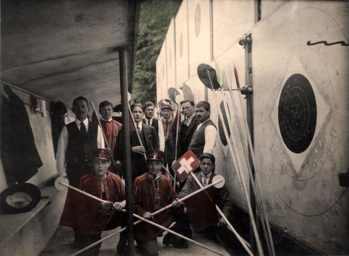 Der Wunsch nach Farbe war freilich auch im frühen Zeitalter der Fotografie gross. Deshalb wurden die Farben oft manuell auf ein Schwarz-Weiss-Foto aufgetragen. Schützenverein Spreitenbach, Urheber des Fotos unbekannt. Archiv des Ortsmuseums.