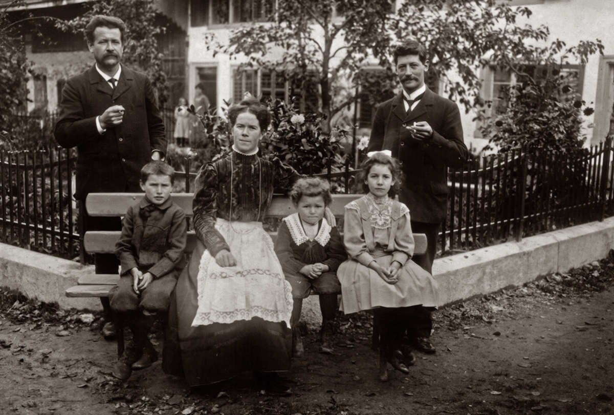 Bei Richard Wiederkehr, Kirchstrasse 15/17, ca. 1910: Otto Gsell, Lehrer, Martha Fricker, Lehrerin, Karl Näf, Lehrer, Gsell, Karl Näf Jr., Maria Näf (Restauriertes Foto aus dem Nachlass K. Wassmer). Sammlung Ortsmuseums Spreitenbach. Urheber unbekannt.
