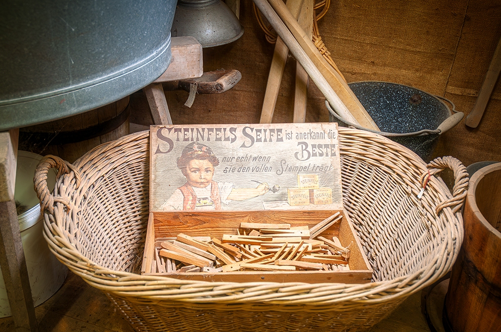 Gut erhaltene antike Holz-Seifenkiste Steinfels mit Wäscheklammern. Scheune, Ortsmuseum Spreitenbach. Foto: R.H.