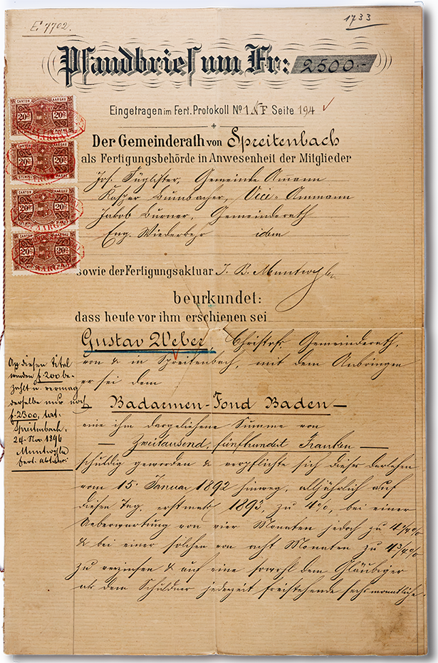 Pfandbrief aus dem Jahre 1892 zugunsten des Badarmen-Fonds Baden. Der Badener Landvogt Franz Ludwig Graffenried schuf diesen Hilfsfonds 1754, der aus privaten Spenden geäufnet wurde. Mit der Almosenvergabe beauftragten die Landvögte den reformierten Pfarrer in Baden. Historische Dokumente wie dieses aus den Beständen des Ortsmuseums, dokumentieren wirtschaftliche Nöte und tragische Schicksale. Foto: R.H.