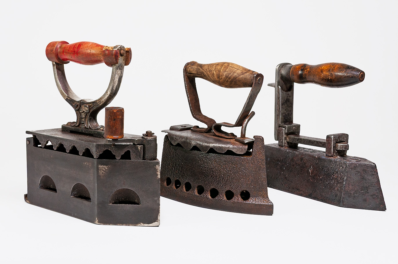 Eine Auswahl antiker Kohle-Bügeleisen aus dem 19. Jahrhundert aus dem Fundus des Ortsmuseums Spreitenbach. Foto: R.H.
