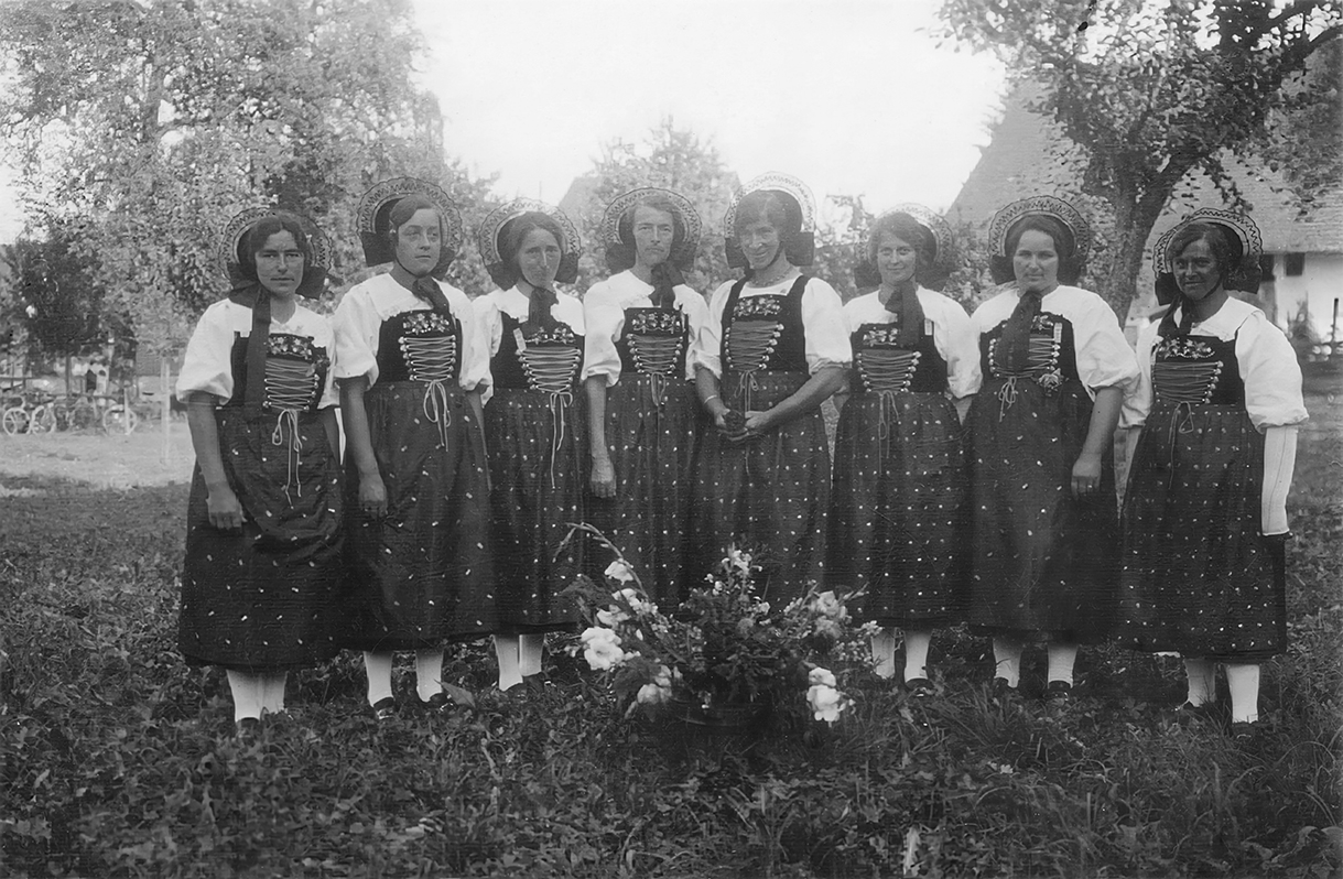 Schweizer Volkstrachten sind uralt, bodenständig und in ihren Erscheinungsformen überliefert und unveränderlich. Das denken Sie wirklich? Dann ist es Zeit, dieses Bild zurechtzurücken: Die Schweizer Trachten sind genau besehen das Resultat modischer Verspätungen. Was in Paris, bei den Adeligen und in den Städten getragen wurde, erreichte die ländliche Bevölkerung oft erst mit erheblicher Verzögerung und wurde dort über längere Zeit beibehalten. Die Bauern trugen also im Grunde genommen veraltete Stadtmoden, die sie durch die Verwendung selbst hergestellter, solider Stoffe und ausgerichtet an die spezifischen Anforderungen ihres Berufes zu etwas Eigenem entwickelten; zu dem, was wir heute als "Tracht" kennen.