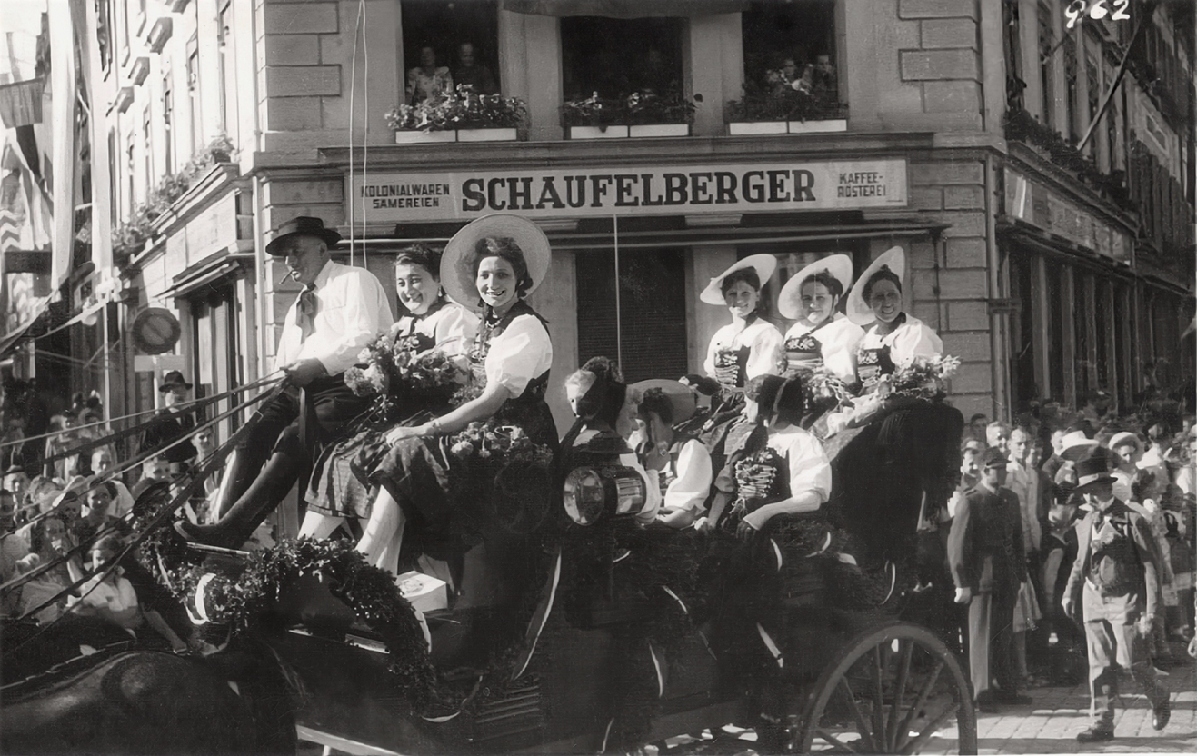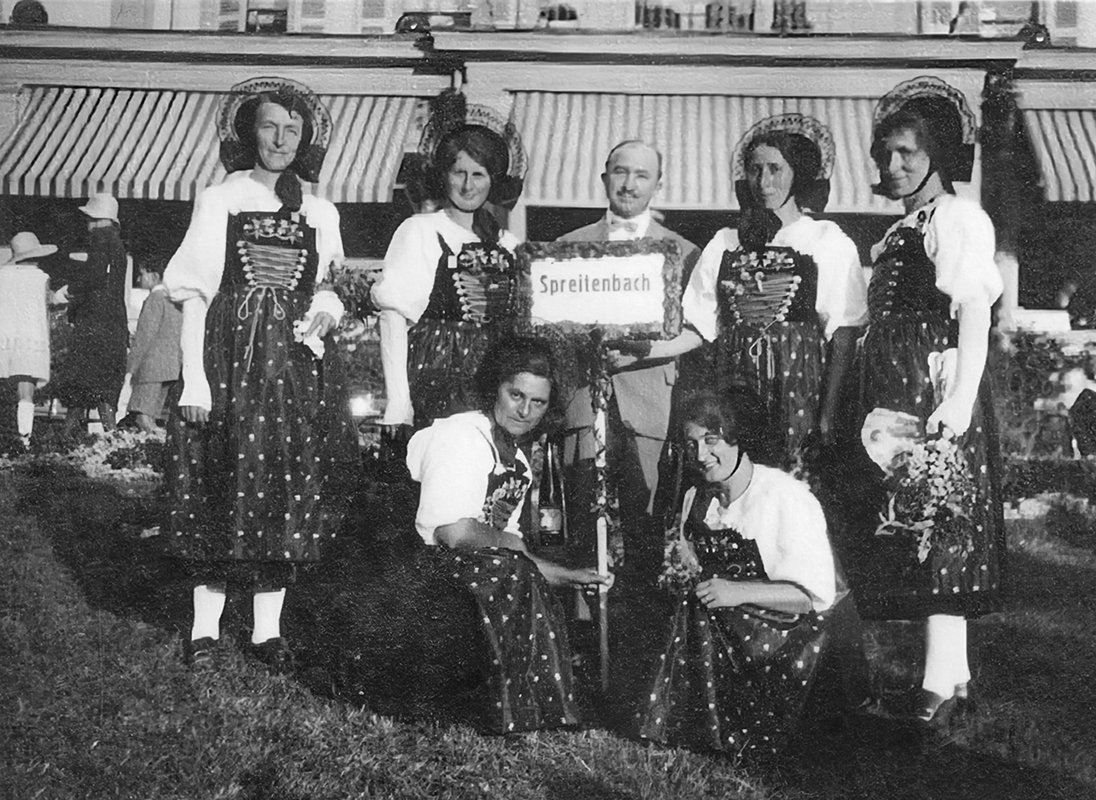 Trachtengruppe Spreitenbach an der Badenfahrt 1937. Trachtengruppen erfreuten sich an Grossanlässen und bei repräsentativen Aufgaben zunehmender Beliebtheit. Foto: Trachtenverein Spreitenbach, Gemeinde-Archiv.